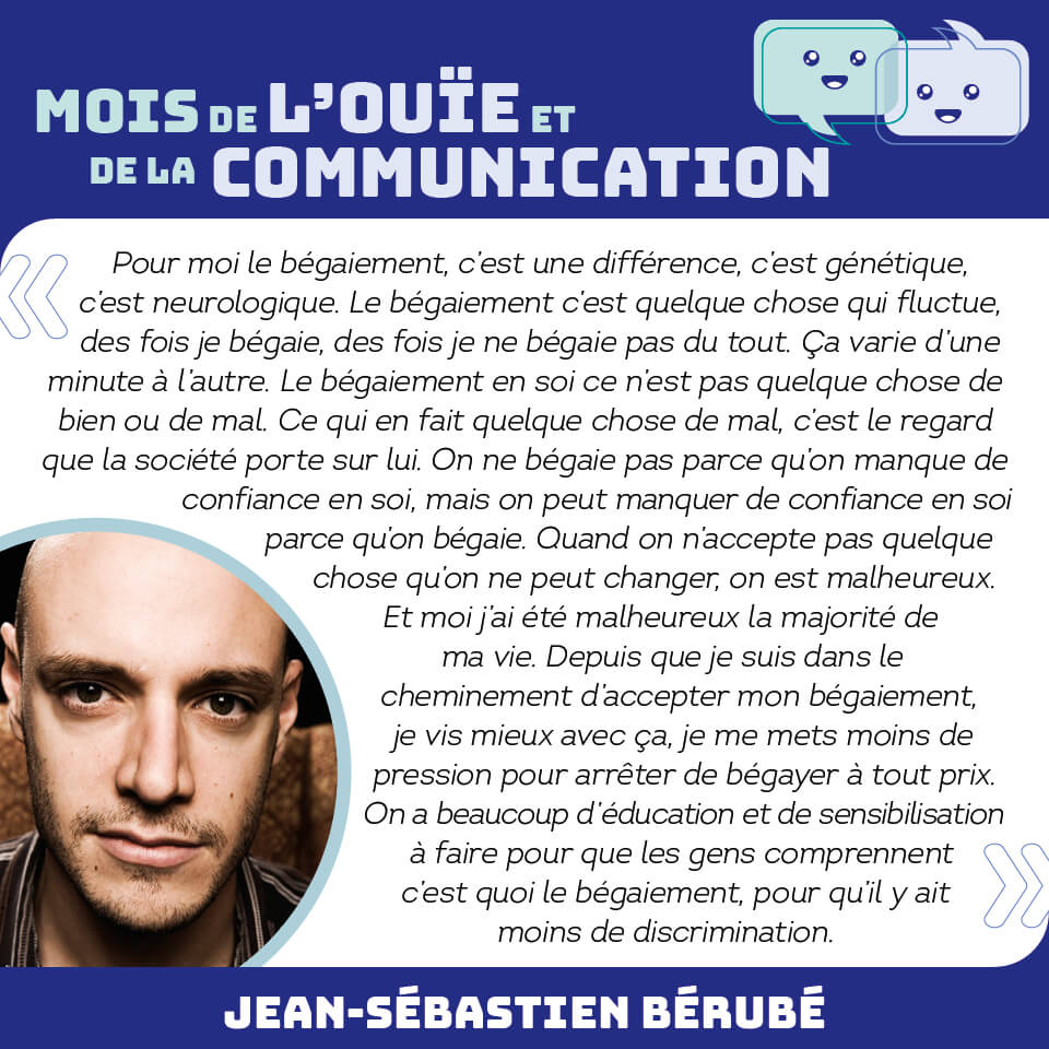 En ce mois de l’ouïe et de la communication, et à l’occasion de la campagne de sensibilisation que nous menons conjointement avec l’AJBQ Association des jeunes bègues du Québec, nous vous partageons le témoignage de Jean-Sébastien Bérubé, adulte qui bégaie et auteur de bandes dessinées.