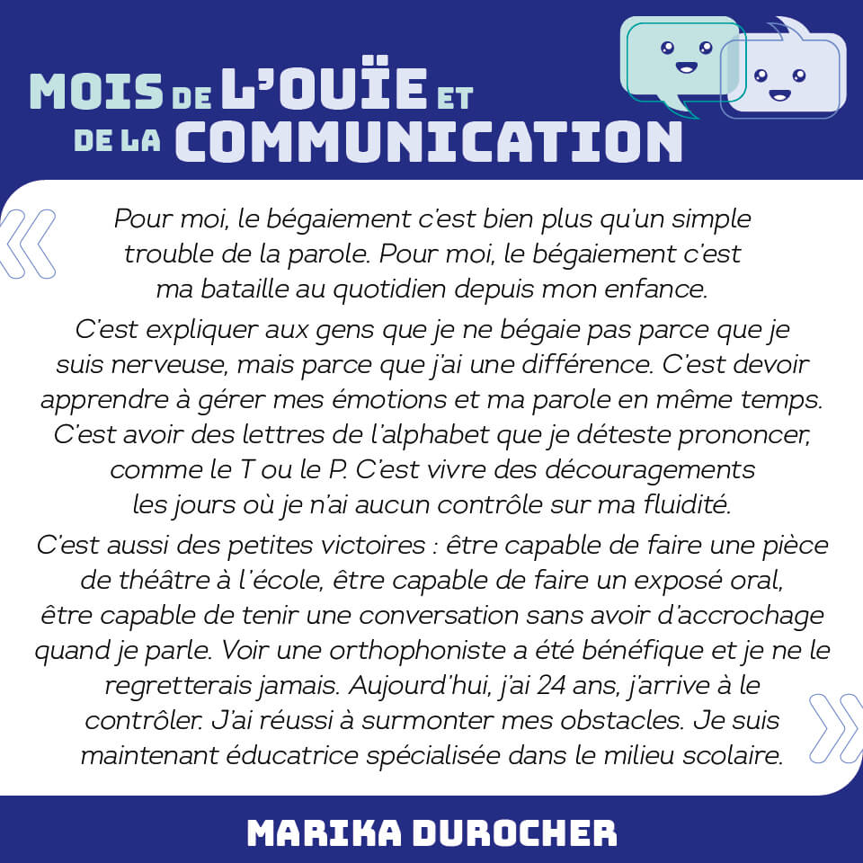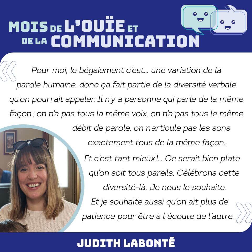 En ce mois de l’ouïe et de la communication, et à l’occasion de la campagne de sensibilisation que nous menons conjointement avec l’AJBQ Association des jeunes bègues du Québec, nous vous partageons le témoignage de Judith, orthophoniste et co-animatrice du podcast « Je je je suis un podcast ». Dans sa vidéo, Judith porte fièrement le t-shirt « Je je je suis un t-shirt », produit par l’ABC.