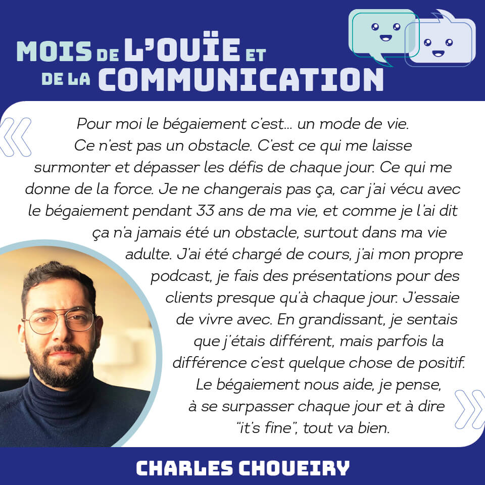 En ce mois de l’ouïe et de la communication, et à l’occasion de la campagne de sensibilisation que nous menons conjointement avec l’AJBQ Association des jeunes bègues du Québec, nous vous partageons le témoignage de Charles.